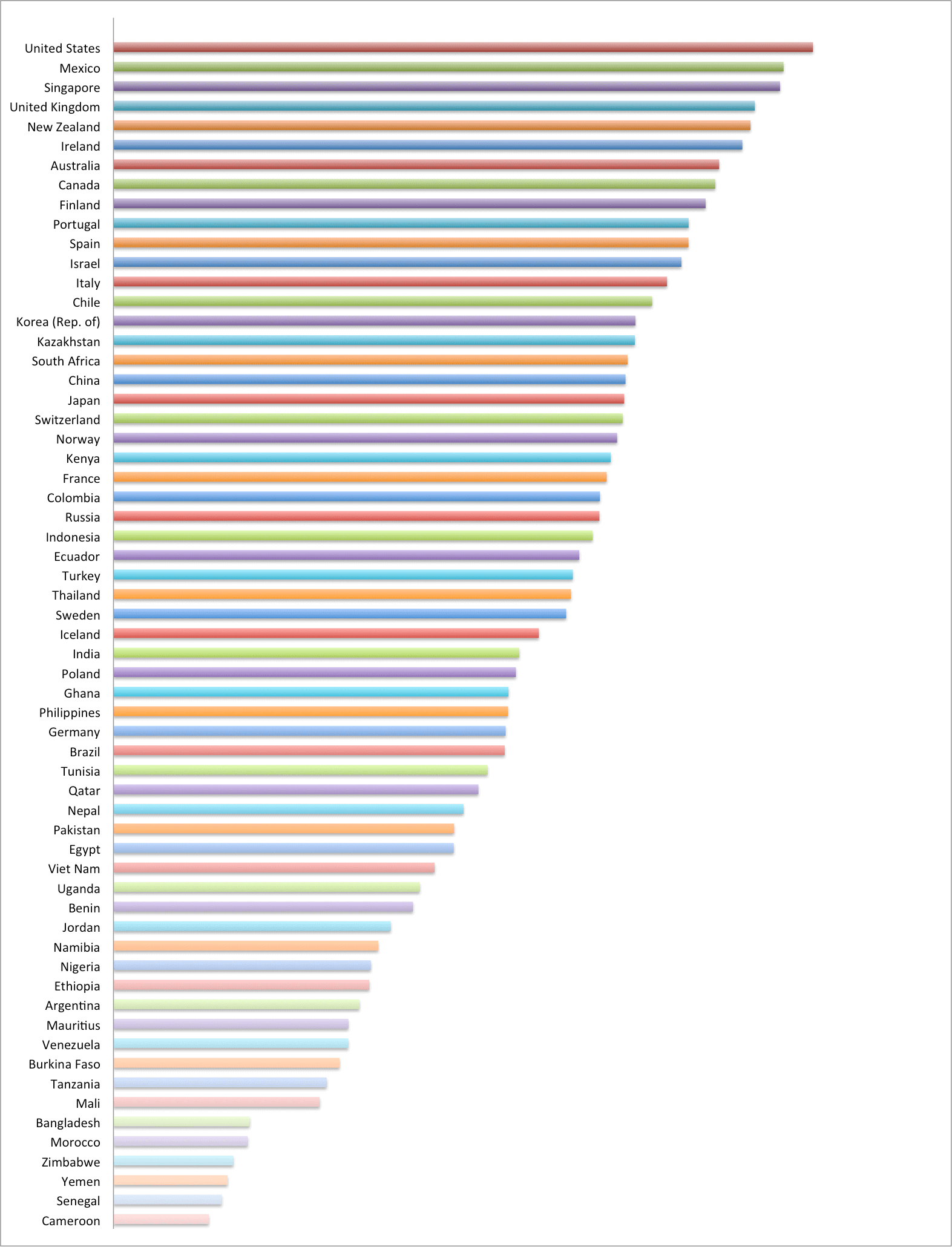- 61 countries were measured, from the US to Cameroon. Where is Belgium?! It seems almost ludicrous that sufficient data would be available for a considerable number of developing countries, and not for Belgium, or that no Belgian experts could be found to fill out the survey. Does this mean that Belgium is not even a blip on the open data radar? Something to think about, I would say…