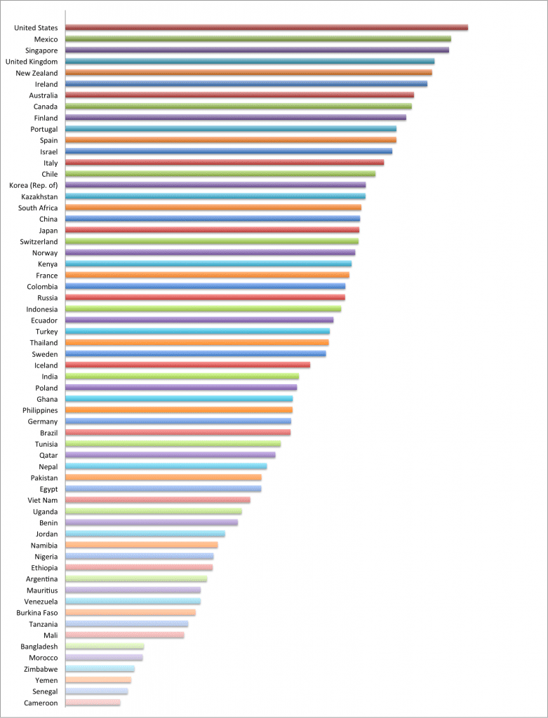 • 61 countries were measured, from the US to Cameroon. Where is Belgium?! It seems almost ludicrous that sufficient data would be available for a considerable number of developing countries, and not for Belgium, or that no Belgian experts could be found to fill out the survey. Does this mean that Belgium is not even a blip on the open data radar? Something to think about, I would say…